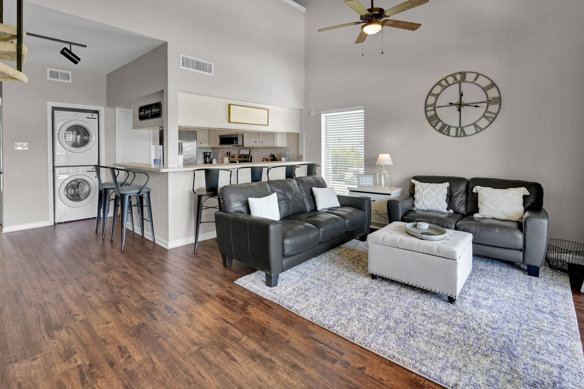 Direnovasi, banyak tingkap. Tilam Beautyrest, topper TEMPUR-PEDIC utama, 2 katil, 2 1/2 bilik mandi, ruang belajar, dan kemudahan dobi di lokasi. Tiada permaidani. Kaunter kuarza. Balkoni di luar master. WiFi berkelajuan tinggi. TV dengan Roku (log masuk ke Netflix anda, Prime Video). 3 minit ke lebuhraya I-45, sesuai untuk komuter ke lapangan terbang IAH, pusat bandar Houston, dan banyak lagi. Di tengah-tengah The Woodlands, berhampiran Cynthia Woods Pavilion, Market Street, dan banyak peluang kehidupan malam. Kami tidak sabar untuk menjadi hos anda!