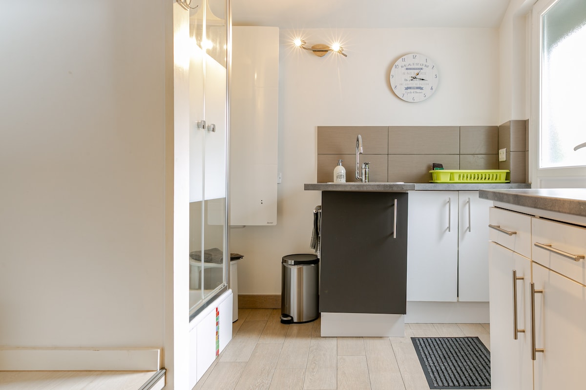 T1 bis 2 orang, dengan lokasi yang ideal, di persimpangan jalan Vannes, pantai dan lanskap yang menakjubkan di Teluk Morbihan (hanya 10 minit). Perumahan bebas, boleh diakses melalui tangga. Katil queen (160cm), sofa bed 1 orang di ruang tamu, dapur kecil lengkap, bilik mandi, ruang makan, TV, Wi-Fi Caj tambahan sebanyak 15 euro semalam untuk tetamu ke-3