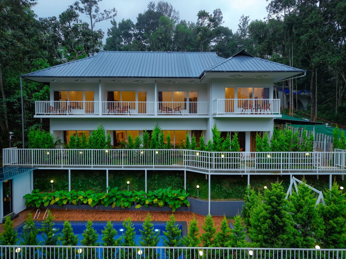 Terletak di lereng gunung berkabus di Munnar, Blackberry Hills adalah tempat percutian eko yang tenang yang menawarkan pemandangan lembah yang menakjubkan, pengalaman terpilih, dan hospitaliti yang mesra. Vila yang luas sesuai untuk keluarga, dengan bilik tidur yang selesa, ruang tamu dan balkoni peribadi yang menawarkan pemandangan lembah yang menakjubkan, dan hiasan dalaman yang hangat yang menggabungkan keselesaan dengan alam semula jadi. Terletak di dalam resort eko yang tenang, nikmati akses mudah kepada denai alam semula jadi, merasa teh, dan banyak lagi. Sesuai untuk berhubung semula dengan orang tersayang di tengah-tengah Munnar.