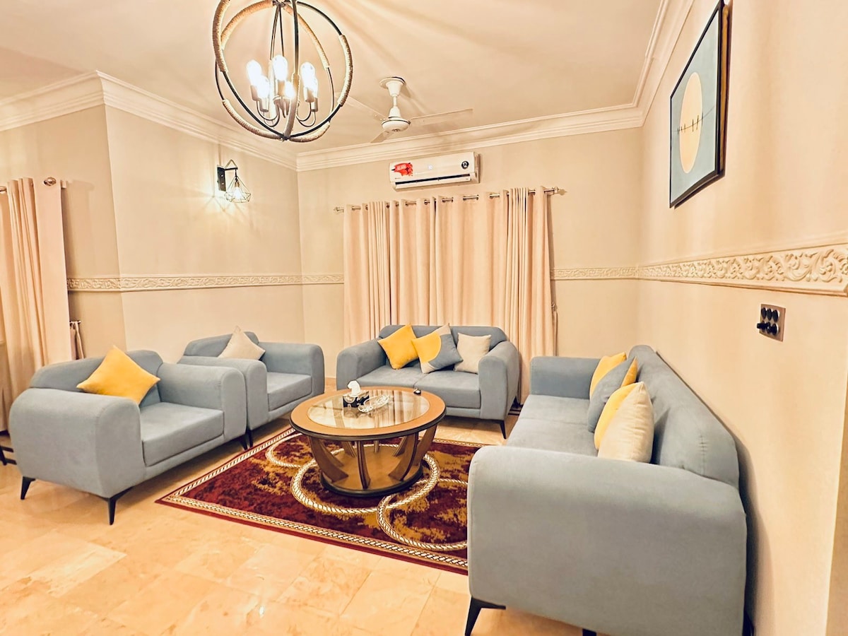 Percutian Keluarga Sempurna "Di mana Keselesaan Bertemu Kemudahan." Apartmen yang tenang dan baru siap dibina -1 Bilik Tidur – Reka bentuk minimalis -1 Bilik Mandi Penuh & Bilik Bedak - Ruang Tamu Selesa - Dapur kecil - Tempat Letak Kereta Khusus - Daftar Masuk Sendiri - Penghantaran Makanan: Wild Wings, Subway, OPTP, Cheezious -2-Min Berjalan Kaki ke Mart, Gimnasium, Salon, Taman - Farmasi & Shaheen Chemist – 3 minit jauhnya -5-Min Drive to Hospital -3-Min Memandu ke Central Market - Parking PERCUMA KHUSUS