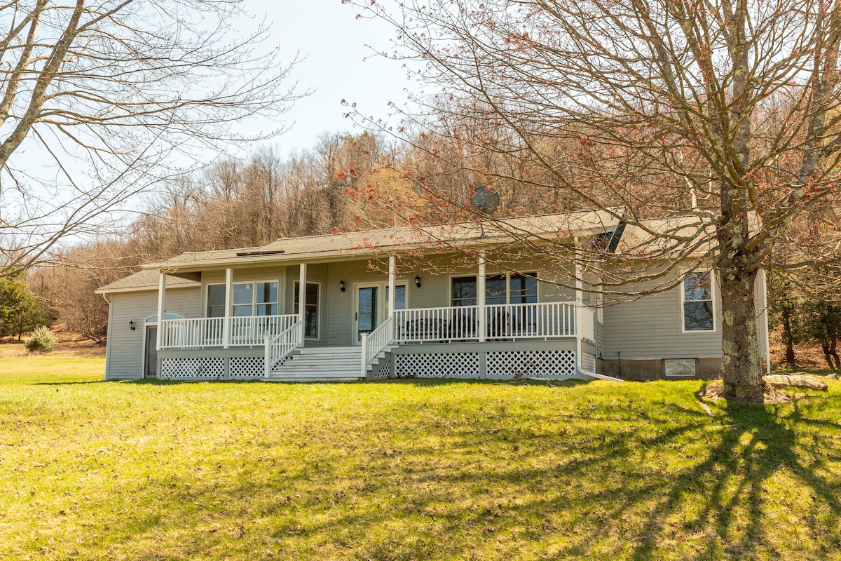 Hanya 85 batu dari NYC! Kotej reka bentuk bergaya desa menanti anda dan rakan atau keluarga anda untuk dinikmati. Percutian desa yang peribadi, selesa & nyaman dengan pemandangan menakjubkan yang terletak di atas 10 ekar bukit-bukau di Catskills selatan, bertenggek di puncak di tepi hutan dengan pemandangan luas sehingga ke sungai Never Sink dengan pemandangan matahari terbenam yang indah dari dek besar kami. Banyak kemudahan. Mesra haiwan peliharaan. Hanya 2 batu di hujung jalan dari Holiday Mountain Ski Resort yang baru dikemas kini!