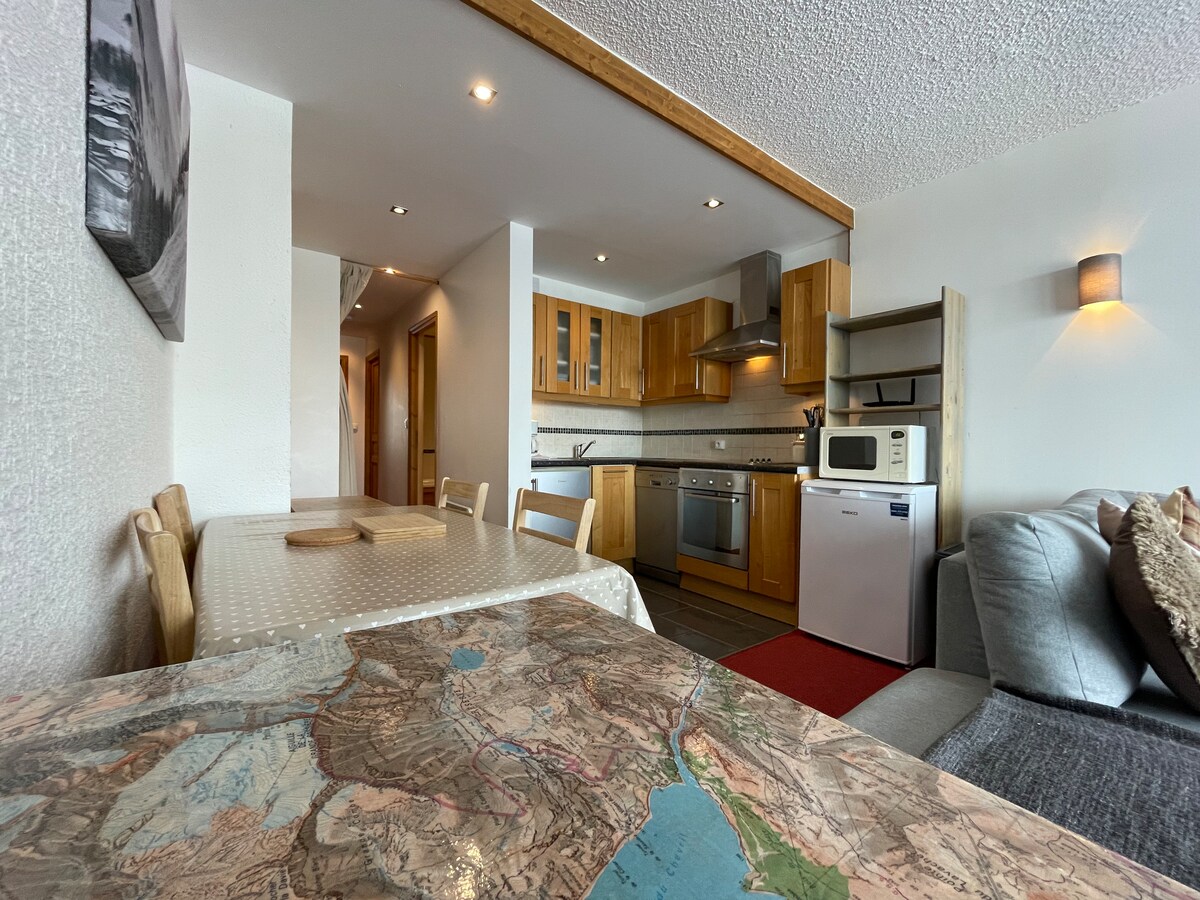 Apartmen 48m2, selesa dan hangat dengan semangat chalet. Mempunyai semua kemudahan untuk membuat anda berasa selesa seperti di rumah. Terletak di pusat bandar. Stesen kereta api sangat dekat dan funikular untuk sampai ke Les Arcs 5 minit berjalan kaki melalui jambatan pejalan kaki! Tempat letak kereta bawah tanah percuma semasa ketibaan yang boleh menampung kereta atau 4 motosikal. Kediaman terkini dengan lif dan lencana pintu masuk untuk keselamatan anda! Daftar masuk dan daftar keluar pada bila-bila masa dengan kotak kunci yang tidak menonjol.
