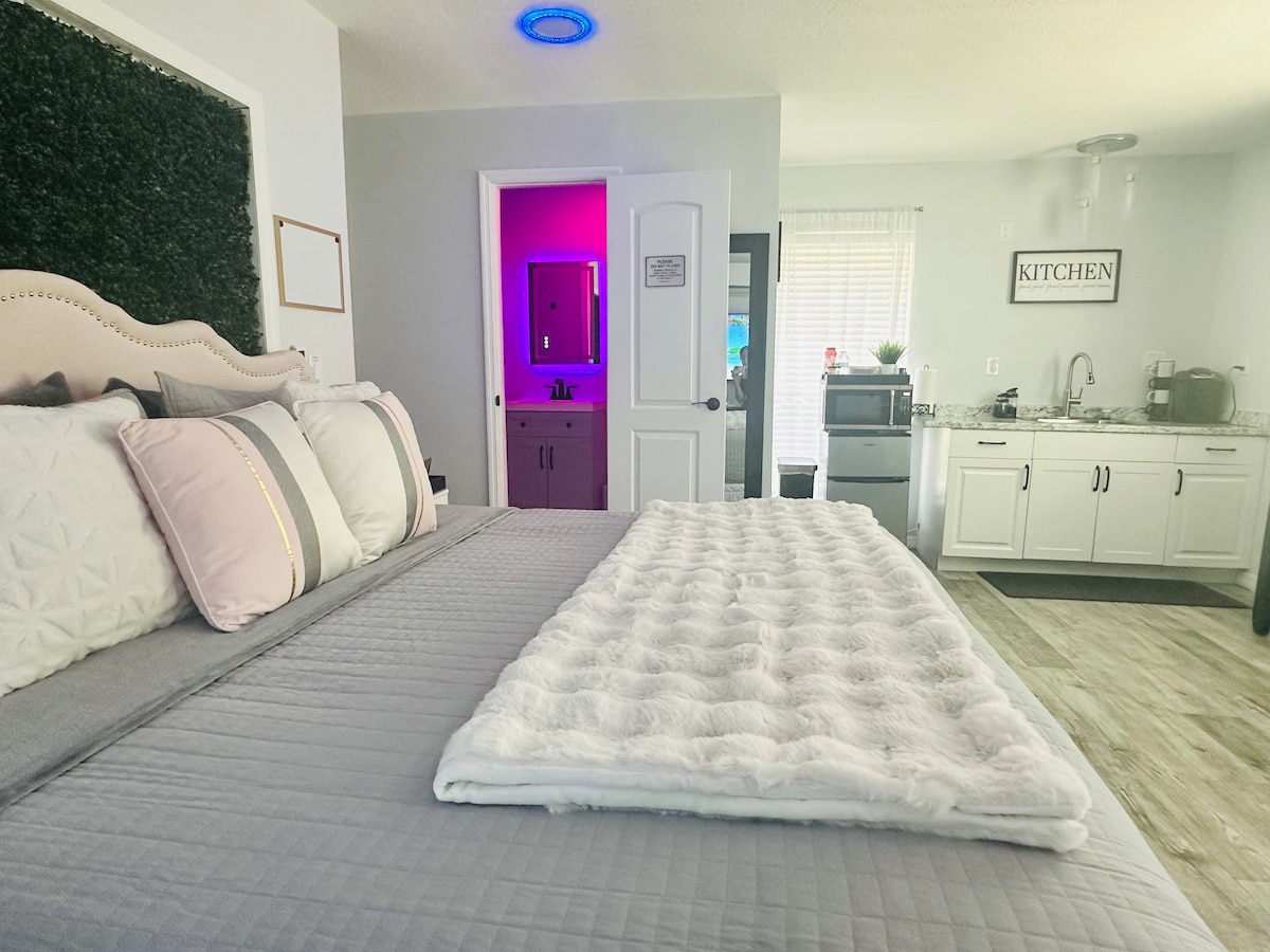 By heart of town conveniently close to many great amenities. Water & land adventures just minutes away! This cozy suite is super inviting & has all you may need for a comfy stay. Private entry with a large driveway parking. Open layout with en-suite bathroom&kitchenette. Windows for natural sunlight. Blue ambiance lights create an enjoyable atmosphere. New king hybrid mattress, seating &dining area, 55" smart TV, Free Wi-Fi + Streaming Apps. Mini fridge&freezer,microwave,coffee maker & more!