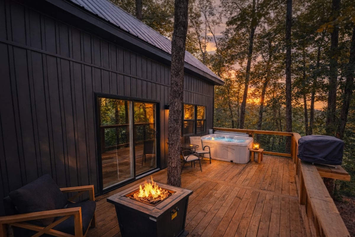 Selamat datang ke The Tree + House di Indian Point! Rumah pokok mewah tersuai ini dibina dengan memikirkan keselesaan dan ketenangan. Sesuai untuk hingga empat orang tetamu, ia dikelilingi hutan dan dipenuhi cahaya semula jadi dari tingkap lantai hingga siling yang mempamerkan pemandangan menakjubkan Tasik Table Rock. Anda akan berasa seperti berada di tempat percutian peribadi anda sendiri, namun masih hanya beberapa minit dari air dan Silver Dollar City. Ia adalah gabungan ideal antara alam semula jadi yang tenang dan gaya moden.