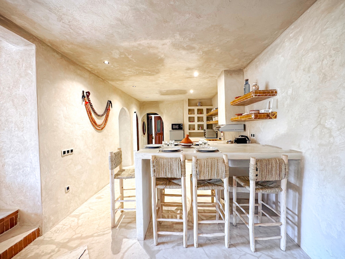 Selamat datang ke rumah Berber bohemia kami, yang terdiri daripada tiga bilik tidur, di tengah-tengah ladang seluas lebih daripada satu hektar. Dari ruang dalaman seluas 150 m², anda boleh mengagumi taman landskap Mediterranean dan kolam renang persendiriannya, kebun zaitun yang luas dengan Pergunungan Atlas sebagai satu-satunya latar langit. Rumah ini, yang berpusat di teres patio, membolehkan anda menikmati sepenuhnya cahaya dan ketenangan. Kolam renang lain tersedia di estet. Keaslian dan keselesaan untuk penginapan yang unik.