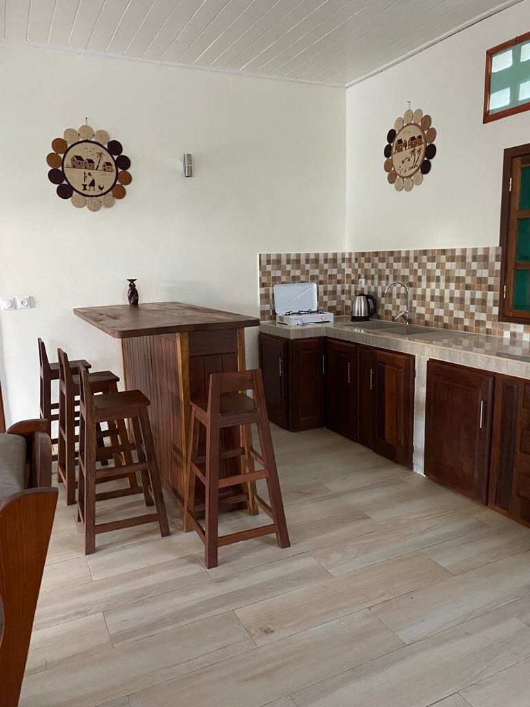 Rumah percutian 100m2 yang indah ini terletak di kediaman yang selamat dan luas, menyenangkan dan selesa. Rumah ini sesuai untuk pasangan, keluarga atau sekumpulan rakan-rakan sehingga 6 orang☀️🥥🍹. Rumah ini 3km ke kawasan dermaga dan berhampiran dengan lorong Baobab yang terkenal Penyenaraian ini mampu berdikari dan disambungkan ke rangkaian Starlink untuk internet. Bergantung pada musim, anda boleh menikmati buah-buahan taman (mangga, oren, pisang,...).