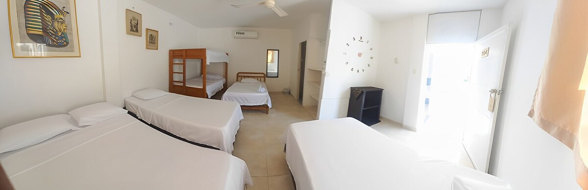 Bilik persendirian untuk 1 atau 4 orang, termasuk katil double, kabin, bilik mandi persendirian, penyaman udara dan TV. Hanya satu blok dari laut, di hadapan bangunan Arrecifes Coveñas. Ya, ia di Coveñas (teluk pertama). Berhampiran dengan laut dan segala-galanya yang anda perlukan untuk berehat dengan baik, kami mempunyai perkhidmatan restoran ☀️