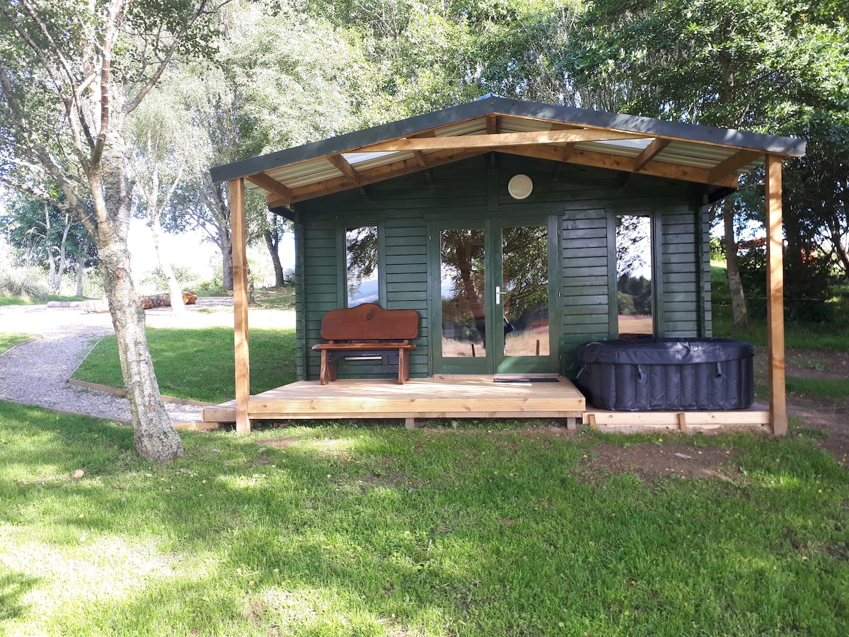 Pondok berbaris kayu yang terletak di dalam hutan di lokasi yang damai dengan kolam berhampiran tetapi dengan akses mudah ke Inverness, North Coast 500 dan pantai barat. Ia mempunyai pemandangan Ben Wyvis yang menakjubkan di mana matahari terbenam pada waktu malam. Ini adalah pondok baru yang kami bina bersebelahan dengan Pondok Merah 500 kami yang telah begitu berjaya tetapi ia mempunyai manfaat dapur kecil. Tab mandi air panas ditempah secara berasingan dan dibayar semasa ketibaan, tab mandi air panas berharga £ 25 semalam.