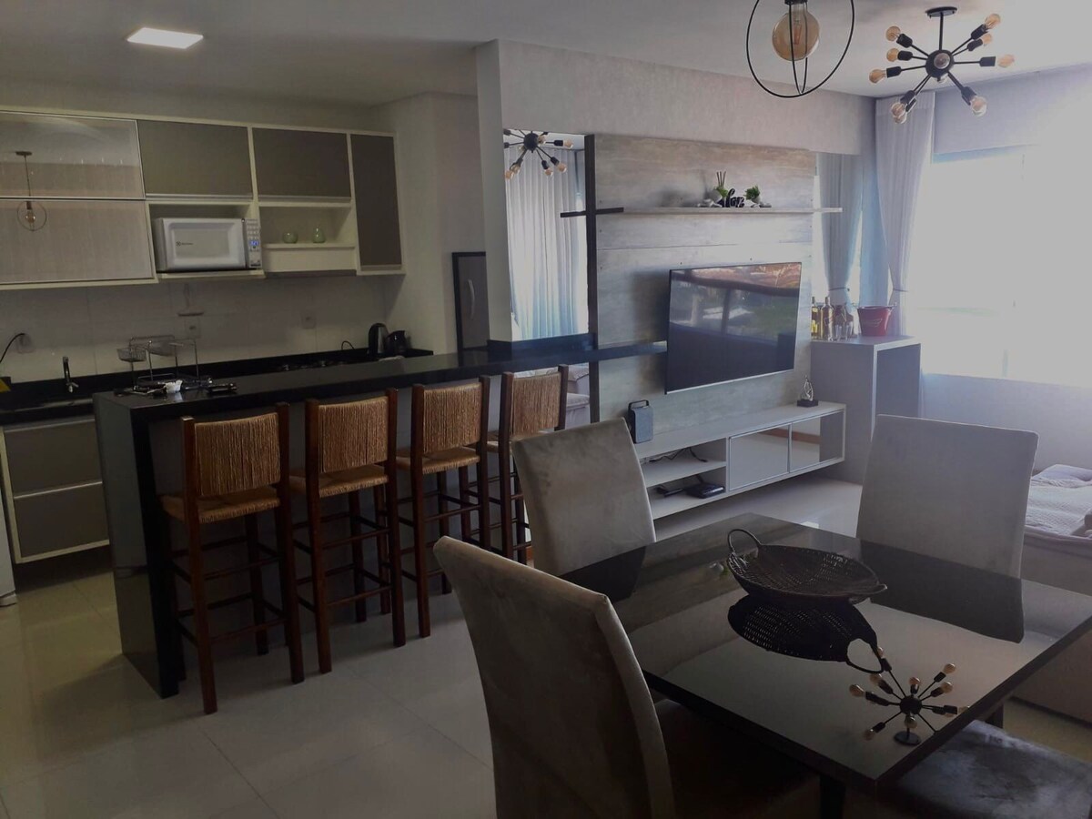🏖️ Apartamento na Praia – Prédio Novo e Moderno, berhampiran dengan Mar. 69m² dengan 2 bilik tidur: en-suite dengan katil double dan 2 katil twin. Semua dilengkapi dengan Segala Keperluan Keluarga, anda hanya perlu membawa barangan peribadi anda. Ia mempunyai WiFi, udara dan TV di setiap bilik. Bangunan dengan gimnasium, dan pancuran mandi luar.