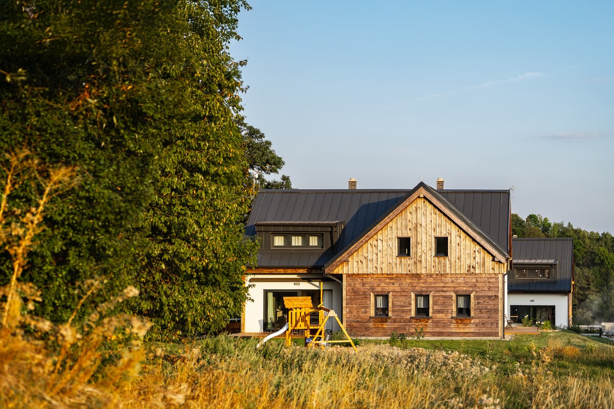 Seluruh keluarga boleh berehat di tempat penginapan yang tenang dengan gaya desa. Rumah desa berusia 200 tahun dengan apartmen tingkat bawah yang dipanaskan oleh pendingin hawa dan/atau dapur kayu. Bilik mandi dan tandas boleh diakses dari kedua-dua bilik secara berasingan melalui koridor di bahagian rumah yang tidak dipanaskan. Di hadapan rumah terdapat tempat letak kereta dan tempat duduk di bawah gazebo dengan pemanggang dan pemandangan ke Černý Důl. Di atas rumah terdapat padang rumput dan hutan dengan laluan ke Černá hora. Lereng ski terletak 5 minit berjalan kaki. Berenang pada musim panas boleh dilakukan di sungai dan di kem dengan kolam renang yang terletak 5km jauhnya.