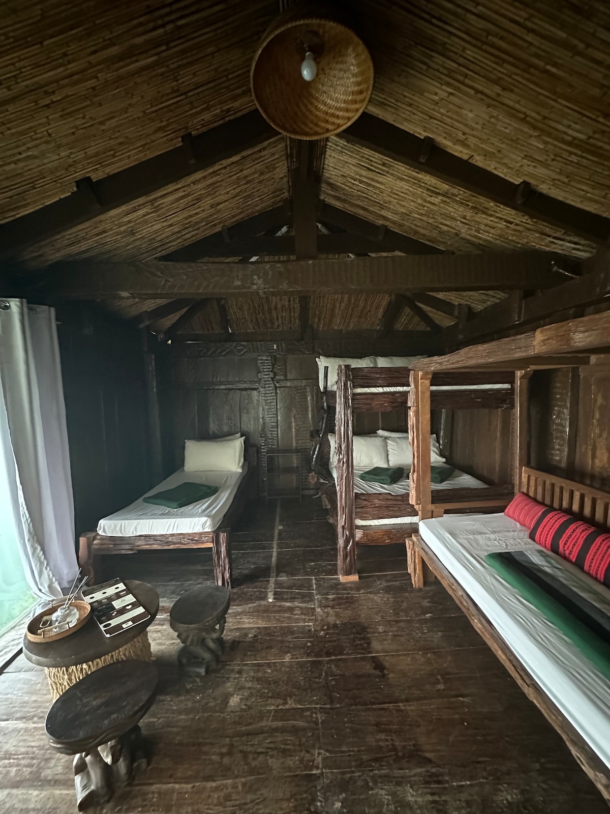 Stay in our modern Ifugao hut and enjoy the view of the mountains in the morning, fog in the afternoon and lights from the greenhouses at night. A mix of wood and glass that would make you enjoy the warmth of the past and the convenience of the present. This is part of a compound, Bali Beata Huts, which has 2 other huts (see our other listing if your group has more than 6 guests). This hut is on the third layer of the compound so guests must climb stairs to get there.