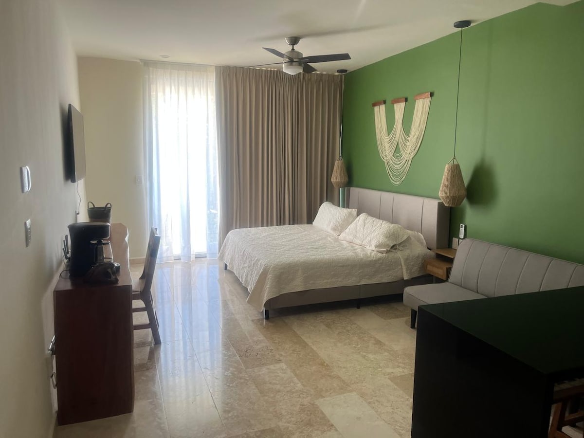 Lovely Studio w/ Beautiful Outdoors & Restaurant - Free Breakfast from Monday - Saturday - On-site Coffee Shop / Restaurant - King Size Bed - A/C in the whole unit - Fiber Optic WiFi (Up to 2000MBPS for the whole property) - Self Check-in after 3:00PM - Smart TV 43" w/ Premium 4K Channels & Netflix - Mini Fridge - Coffee Maker, Coffee, Tea & Bottle of Water - Microwave - Private Bathroom - Cenote water Pool w/ massage jets & Wading Pool - Free Private Parking - 5 Blocks from the main avenue