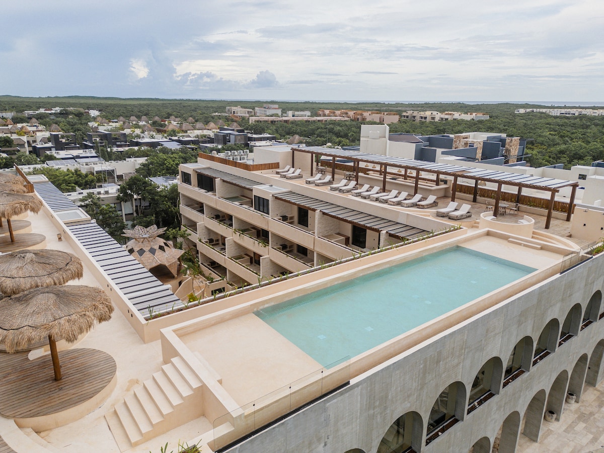 Seni di bawah 4 dinding, tetapi tiada had dalam vila mewah 1 BR baru kami. Sebagai sebahagian daripada salah satu kondominium yang paling mewah dan sesuai untuk bergambar di kejiranan ini, apartmen 1 bilik tidur kami menampilkan: ☆ teres persendirian yang menampilkan jakuzi lengkap dengan sofa puff dan pintu masuk jambatan. ☆ State of the Art boho-Chic decor. ☆ Akses kepada salah satu kemudahan kondominium terbaik Tulum, termasuk gimnasium serba lengkap dan berhawa dingin, 2 kolam renang, bilik spa dan bilik kerja bersama. Teruskan membaca untuk senarai penuh!