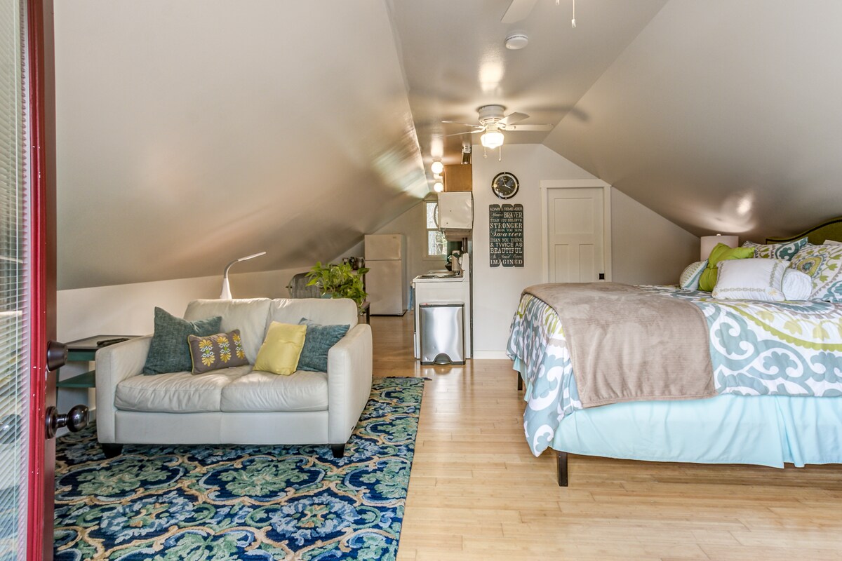 NEW- EV ChargePoint charging station. A quiet loft apartment minutes away from I-90 in a detached building on shared property, off a private dirt road. Located on the base of Mt. Washington you will overlook the wooded terrain with a glimpse of Mount Si in the beautiful North Bend area. An open concept living space is ideal for a private getaway for two. This location is hikers, bikers and snow lovers paradise, just minutes away from Twin Falls trailhead, Mount Si & the Summit at Snoqualmie.