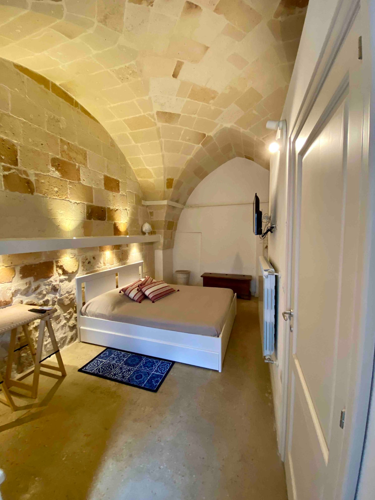 This unique space, carved inside traditional trulli, has its own charm and lets you experience the true spirit of the Itria Valley. You enter through an old strawberry‑grape pergola. The kitchen and bathroom are set in the alcoves, while the dining and sleeping areas are located in a saracen trullo and a tall‑cone trullo. The private patio and nearby infinity‑edge pool offer views of the valley and the skyline of Ceglie Messapica.
