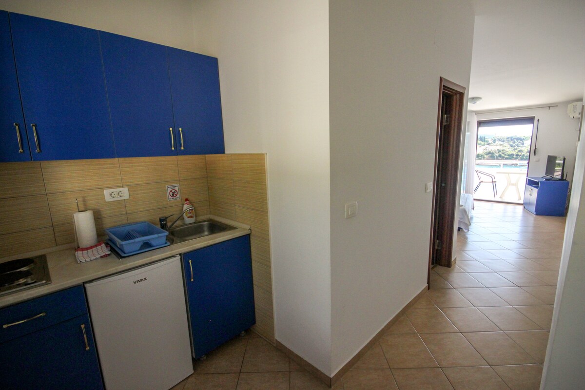 Studio berhawa dingin ini mempunyai balkoni dengan pemandangan laut dan ruang makan, dapur dengan dapur atas, peti sejuk mini, cerek elektrik dan perkakas dapur. Unit ini menawarkan katil double, bilik mandi peribadi dengan kabin pancuran mandi dan pengering rambut, Wi-Fi percuma dan TV. Tetamu juga mempunyai akses kepada: kolam renang luar, pantai konkrit persendirian dengan akses tangga terus ke laut, katil matahari dan payung percuma, teres berkongsi dengan pemandangan matahari terbenam, satu ruang letak kereta bagi setiap apartmen