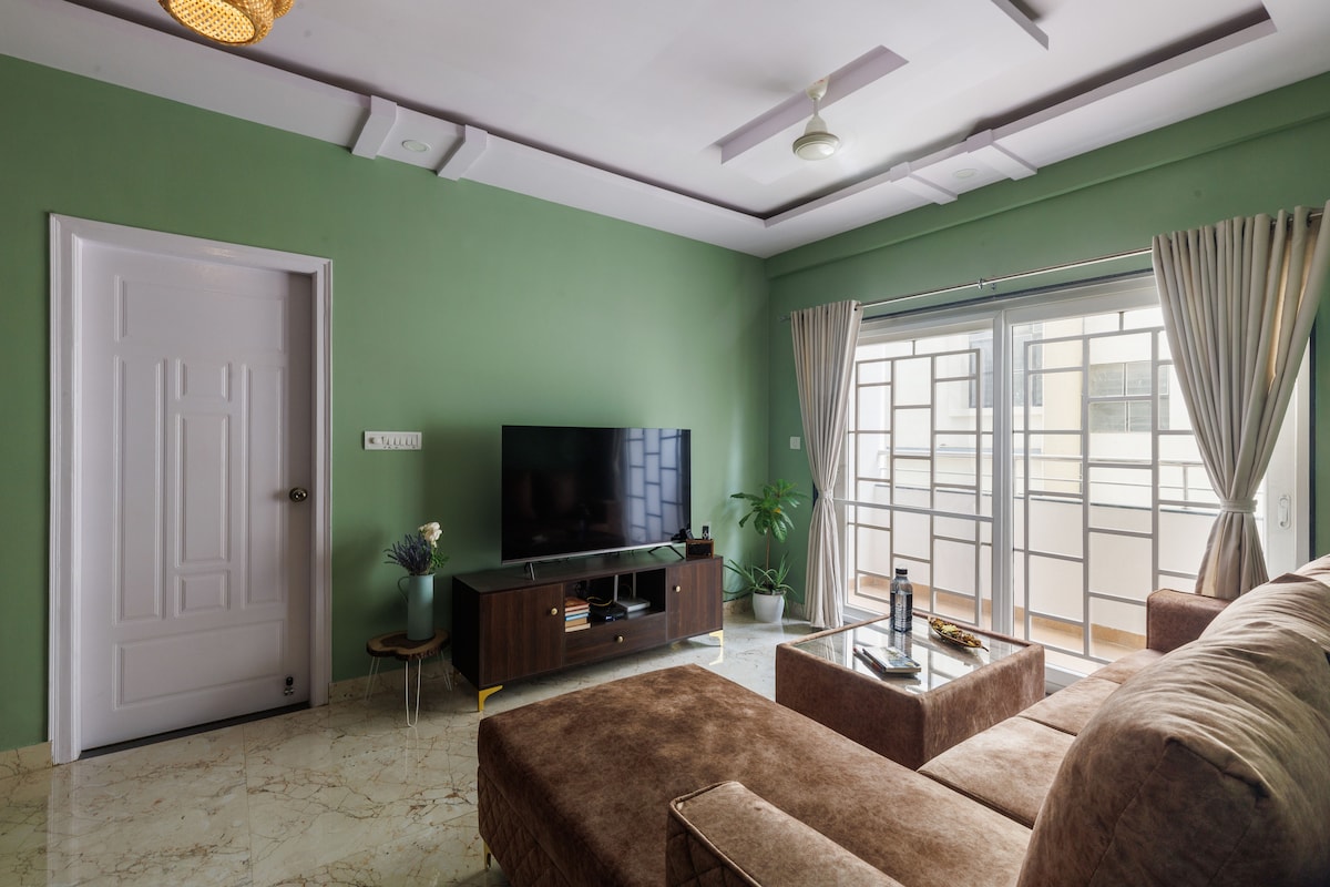 Spacious 600 square feet Designer 1BHK Suite with Private Balcony | High-Speed fibre optic Wi-Fi & Smart TV with streaming platforms, Work/Dining Desk, 24/7 power backup for uninterrupted work and comfort |Luxe King Bed & Orthopaedic Mattress ,wooden wardrobes for storage | fully equipped Kitchenette | Couch Bed in living room , Max.Occupancy 4 | Elevator access, professional housekeeping and access to paid laundry on site for long stays| Located in Central Bangalore | LGBTQIA++ Affirmative