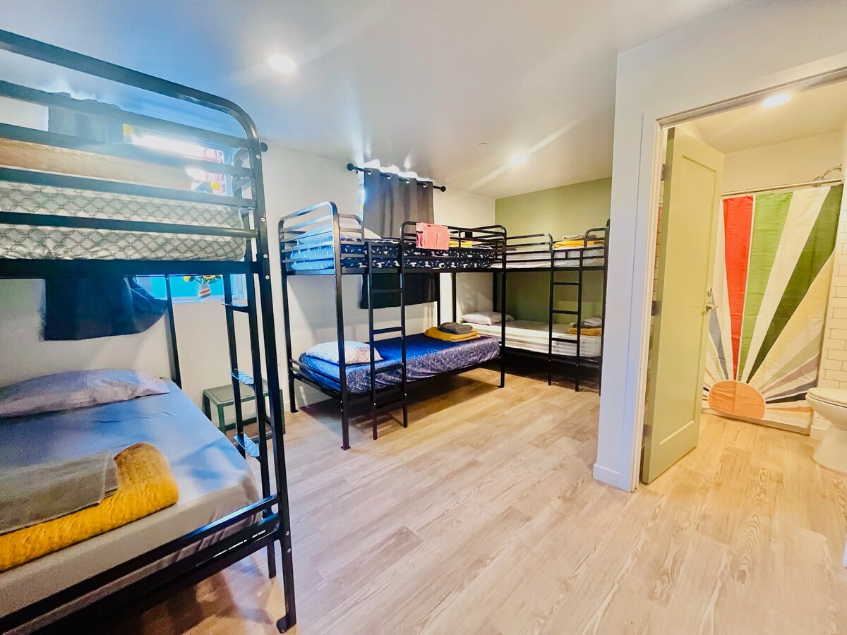 Mari sertai keseronokan ini! Penginapan ski Big Bear Hostel di kampung! Kongsi bilik katil bertingkat besar kami dengan 7 katil (katil bertingkat saiz dewasa sepanjang 6 kaki), sofa, meja kopi, meja dan kerusi. Anda tidur di dalam bilik dengan tetamu lain, tetapi anda boleh menggunakan seluruh rumah dengan bilik mandi berkunci persendirian, dek matahari, dapur & ruang tamu TV. Lokasi Kampung yang Hebat. Berjalan kaki ke restoran, bar, hiburan malam, tasik di seberang jalan. Diskaun Ski Kayak Basikal! TV 4k di ruang istirahat berkongsi. Jika anda mempunyai lebih daripada seorang tetamu, beritahu kami.