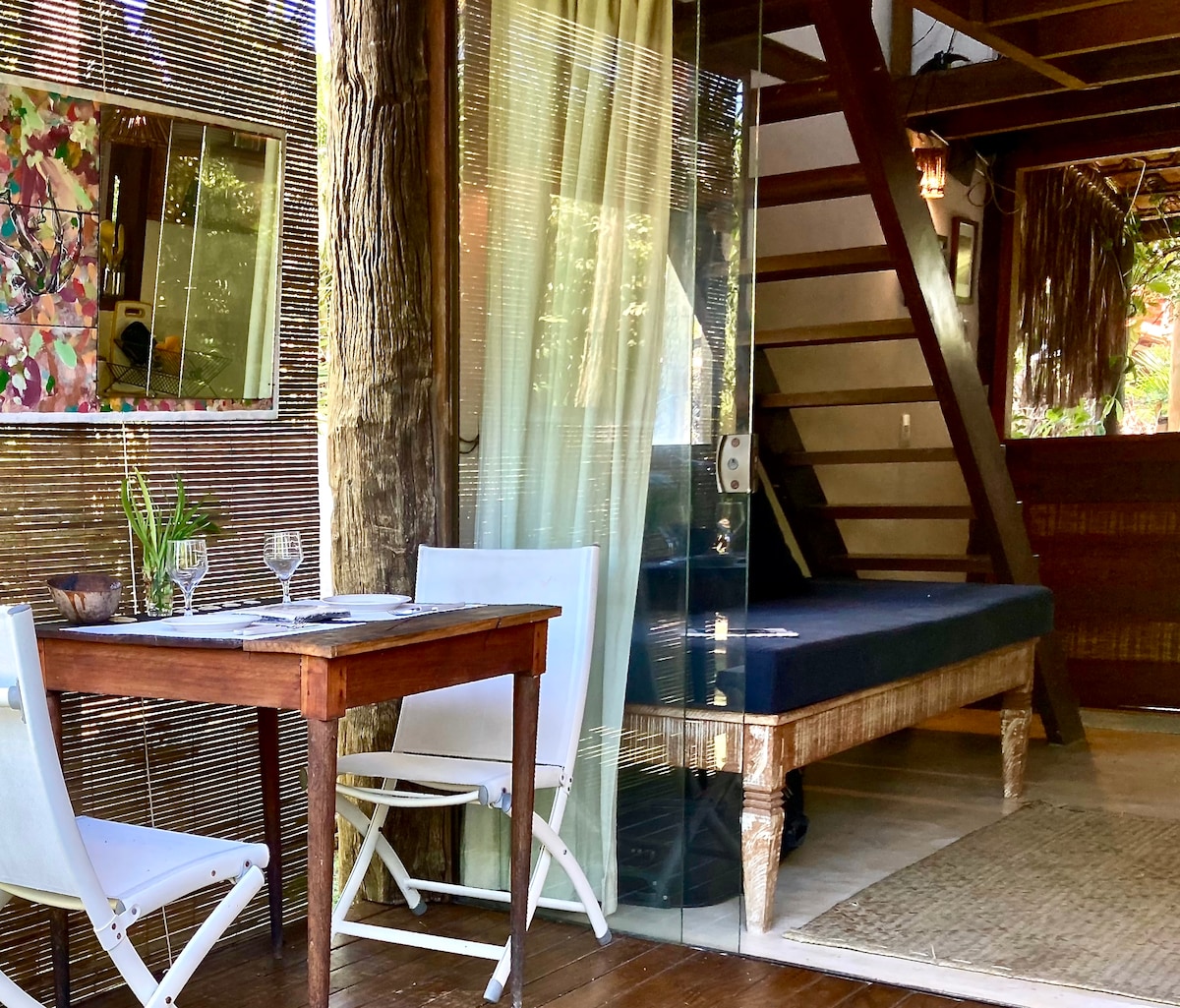 Nikmati suite 18 m² yang menawan ini, syurga ketenangan dan kesejahteraan di tengah-tengah alam semula jadi. Ia mempunyai katil queen dengan kelambu, penghawa dingin, pencahayaan semula jadi dan balkoni dengan buaian rajut. Hiasan desa dan buatan tangan, dicipta oleh pemilik, dan ruang kerja dengan internet yang baik. Dapur luar dilengkapi, termasuk barbeku. Lestari, dengan pemanasan solar dan pengasingan sisa, serta pancuran mandi luaran untuk kemudahan yang lebih baik selepas pantai.