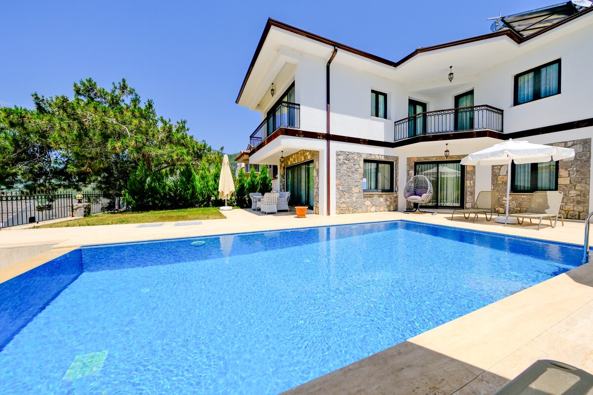 Anda boleh bercuti dengan aman di vila kami dengan kolam renang yang dikelilingi oleh kehijauan di sebelah hutan. Terletak di Fethiye Yesiluzumlu, vila kami luas dan sesuai untuk keluarga dan tetamu istimewa kami. Ia terdiri daripada tiga bilik dan ruang tamu, dan terdapat dua katil double, dua katil single dan dua katil sofa. Kemudahan taman dan barbeku tersedia. Vila kami berjarak 10 minit dari pusat Fethiye dan setengah jam(dengan kereta), 15 minit ke pantai Calis (dengan kereta), 15 minit dari pantai Calis. Haiwan peliharaan dialu-alukan.