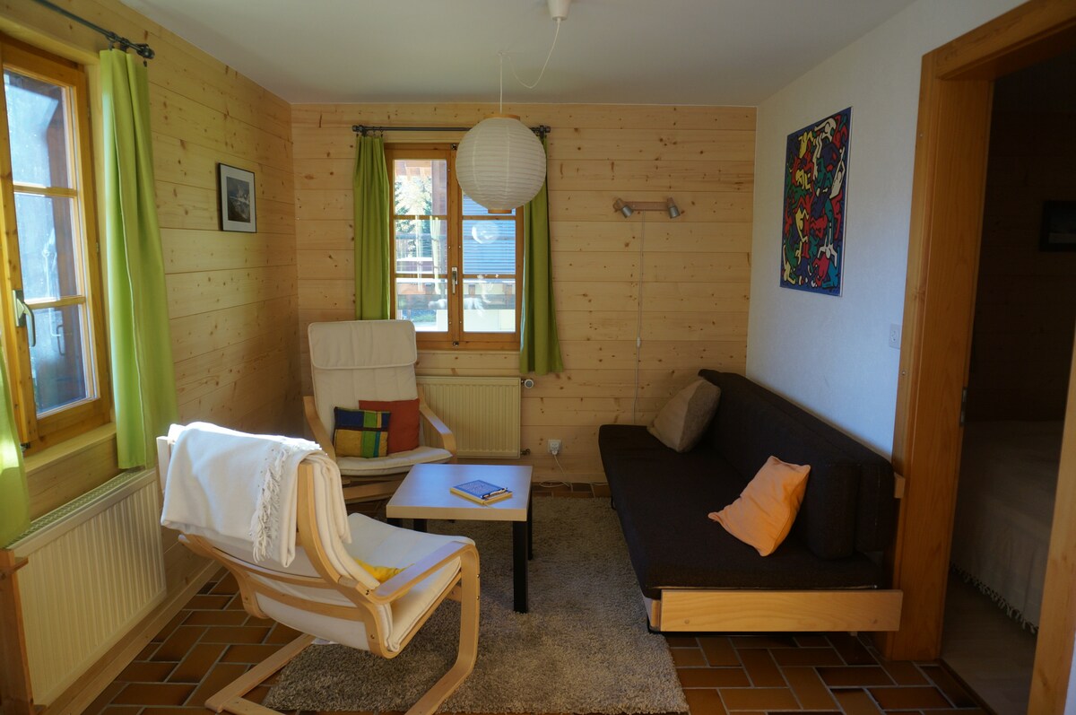 Apartmen Mewah, termasuk 1 bilik tidur dengan katil kelamin, ruang tamu dengan katil sofa yang selesa, dapur dan bilik mandi. Teres yang cantik, sangat cerah. Jakuzi & sauna. Ruang letak kereta persendirian di kaki chalet. Liberty-pass untuk 2 orang dari akhir Mei hingga awal November (bas percuma, tenis, kolam renang, dan lebih daripada 20 aktiviti percuma! Pengurangan 50% pada kereta kabel) Baru: terminal untuk mengecas kereta elektrik anda.