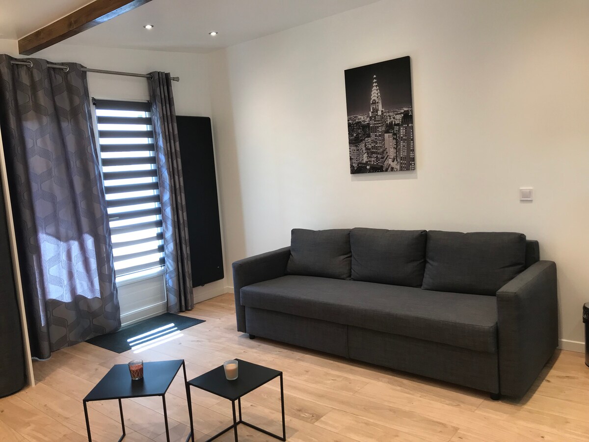 Aulnay Quartier Tour Eiffel, 12 minit berjalan kaki stesen RER B (15 minit dari Paris) dan dengan kereta 20 minit dari Paris dan 15 minit dari Roissy Cdg, di jalan pavilion, apt F2 yang menawan 22 m², selamat dan berfungsi, termasuk pintu masuk, kawasan duduk dengan katil sofa 2 tempat duduk, TV pintar, dapur kecil yang dipasang dan dilengkapi, bilik mandi dengan tandas, bilik yang cerah dengan katil double, 2 meja malam dan almari pakaian, pinggan mangkuk dan linen disediakan, penyaman udara panas, mesin basuh, tempat letak kereta jalan percuma. Kompakan...