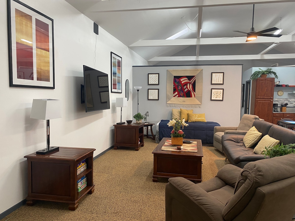 1000 square feet of beautiful open space. High Ceilings, natural light, and lots of amenities make this home exceptional to live in. Outside, you're surrounded by singing birds in high trees. At night, you can light up a roaring fire and relax with friends. The two facets of Indoor Modernity and Outdoor Natural Beauty combine to ensure that your stay is both comfortable and exotic. UPDATE: brand new 65 inch TV just installed for all future stays!