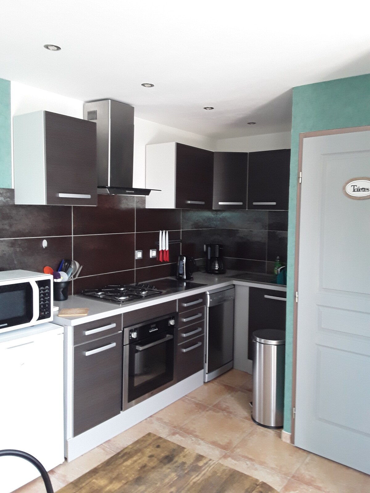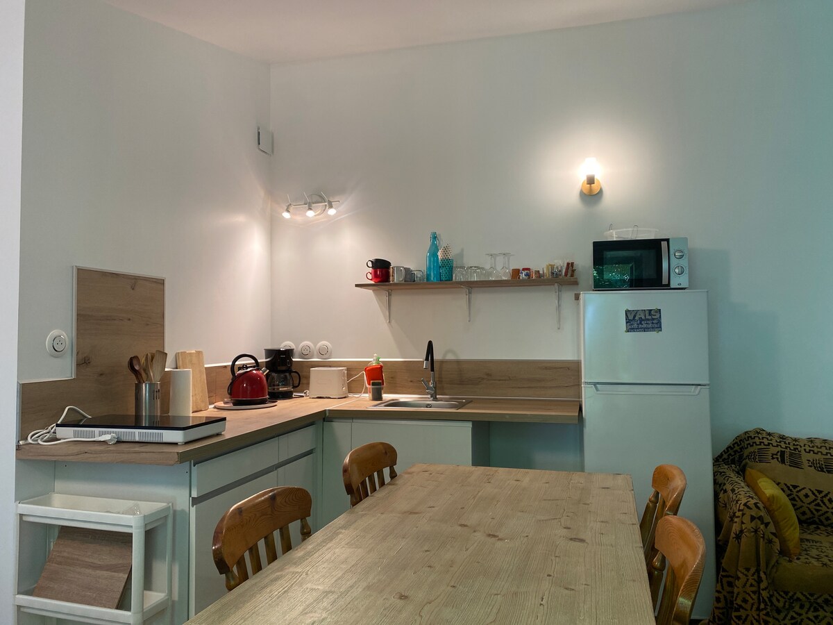 Di pusat bersejarah Aubenas, T1 berkubah batu besar dengan teres tenang yang sangat cantik dan besar ( meja untuk makan tengah hari di luar, bbq, kerusi dek) . Apartmen ini termasuk ruang tamu yang besar dengan dapur kecil . Bilik mandi dengan pancuran mandi . Ia mempunyai satu 160 katil dan satu katil sofa yang selesa. Keupayaan untuk meningkatkan kawasan permukaan dan tidur dengan menyewa apartmen tingkat dua. Maklumat atas permintaan