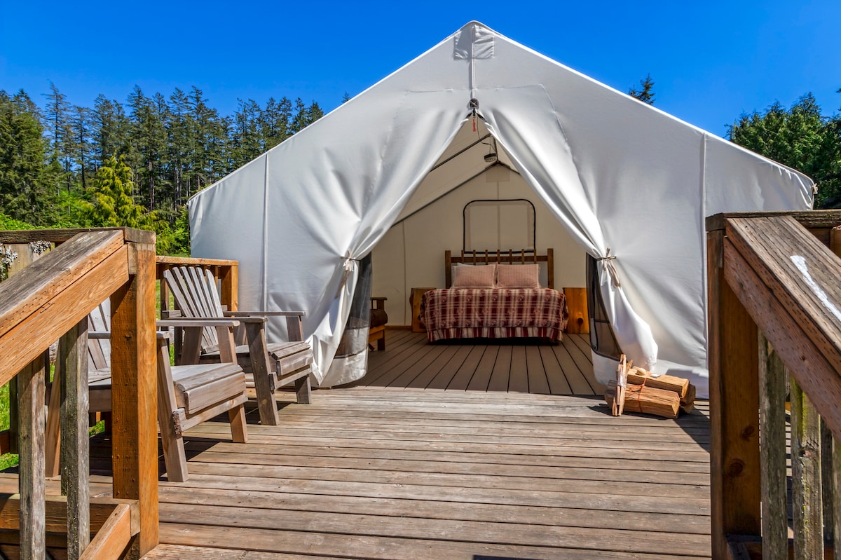 Khemah kanvas unik di bawah struktur tiang cedar dengan semua kemudahan yang anda perlukan untuk pengalaman "tidak begitu kasar". Light casts dancing shadows along the tent as you settle into a king size bed with bamboo, linen sheets and feather blankets . Terdapat selimut bulu tambahan untuk anda membungkus diri anda semasa anda duduk di dek tertutup untuk melihat bintang-bintang dan berehat selepas seharian mengembara dan mendengar ombak menghempas sambil anda menikmati secawan kopi Starbucks daripada pembuat Nespresso.