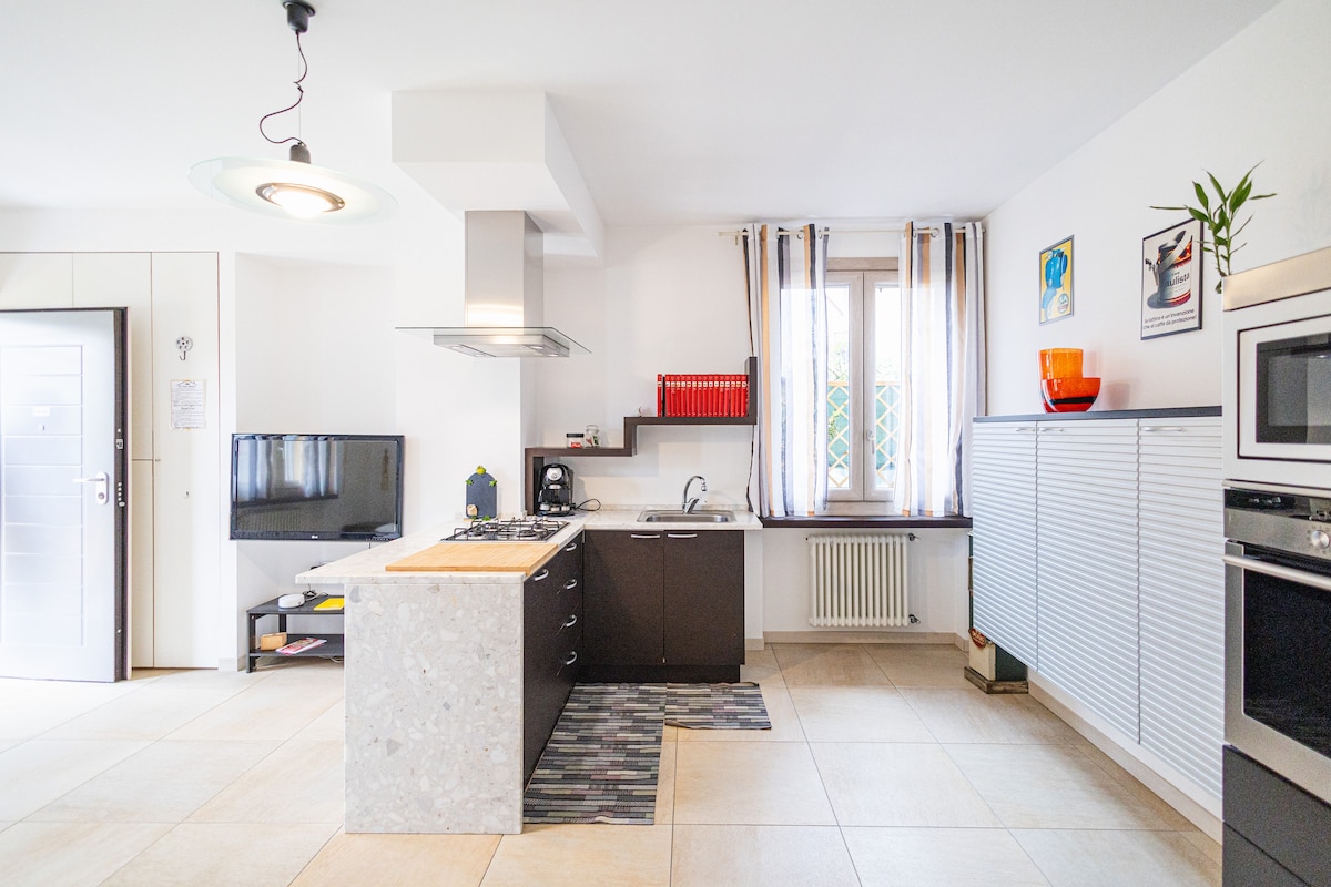 Apartmen kecil dan comel yang baru dilengkapi perabot di tingkat satu bangunan baru-baru ini, sesuai untuk mereka yang mencari ketenangan dan keselesaan 15 minit dari Rho Fair. Apartmen ini terdiri daripada ruang makan dengan sofa dan TV, dapur lengkap, koridor, bilik mandi dengan pancuran mandi, bilik tidur dan katil double. Dilengkapi dengan pemanas dan penyaman udara bebas; wi-fi percuma. Teres luar berkongsi.