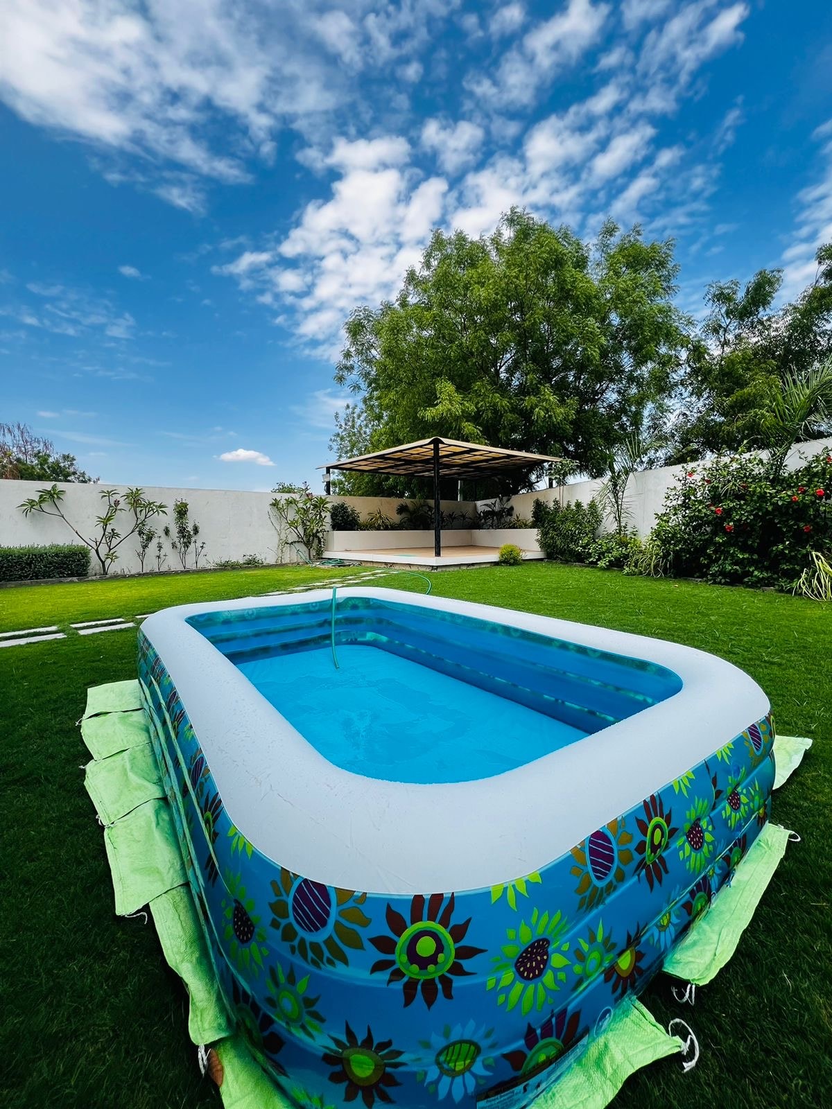 Rumah ladang yang cantik dengan penginapan yang selesa sehingga 12 tetamu, dengan 2 bilik tidur AC, ruang duduk, dengan dapur & kemudahan memasak yang berfungsi sepenuhnya & kolam renang kecil, taman hijau subur yang besar, caj untuk 2 tetamu adalah tetap untuk mana-mana tetamu tambahan, setiap tetamu 400 boleh dikenakan caj, tanpa mengira penginapan tiada penginapan. Penalti 1000 Rupee, jika didapati lebih ramai tetamu daripada yang disebutkan sebelum tempahan. Rancang Open Sky Movie atau Mehndi, BabyShower atau DJ night, Parti Hari Lahir, Keluarga atau Sekolah atau Kolej Reunion.
