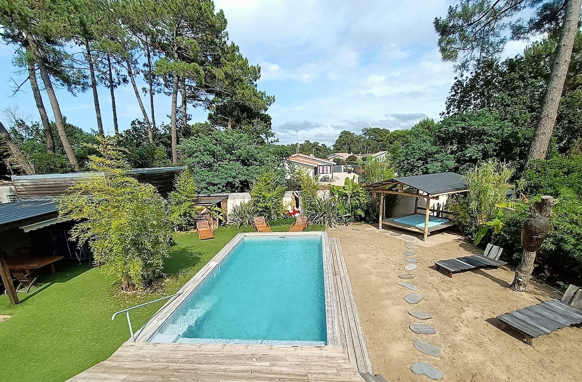 Penginapan bebas rumah utama yang terletak 10 minit berjalan kaki dari pantai dan pusat Montalivet les Bains. Nikmati ruang persendirian termasuk: - 1 bilik tidur dengan katil 160 cm, - ruang tamu persendirian dengan sofa dan TV, - bilik mandi bebas yang dilengkapi dengan pancuran mandi, double vanity, - tandas bebas, - dapur luar yang tertutup dan lengkap, - akses ke kawasan luar umum: taman tertutup dan landskap, pancuran mandi luar, katil berjemur, kolam renang.
