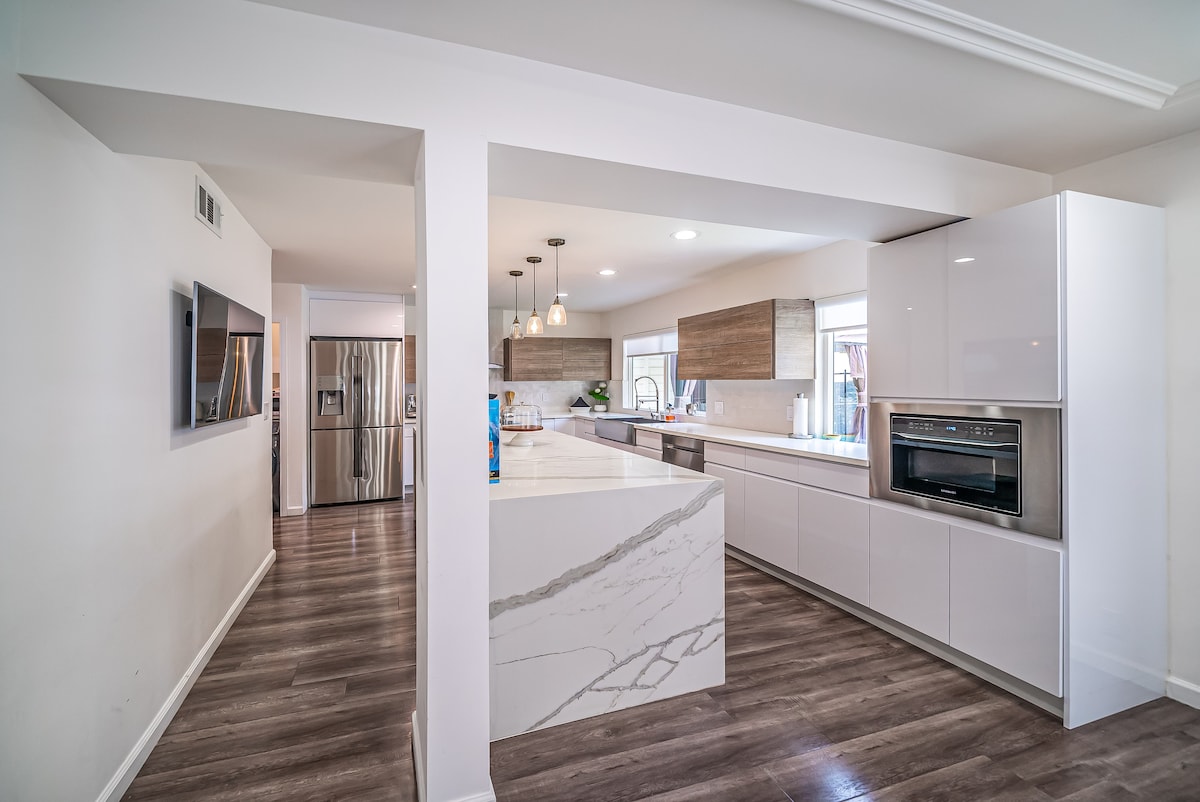 Masuk ke dalam kemewahan dan keselesaan di oasis 3BD 2BA kami yang baru diubahsuai di Venice Blvd yang meriah! Dengan hiasan bergaya dan suasana mesra keluarga, rumah kami menjemput anda untuk berehat dengan bergaya. Berehat di katil King, sediakan makanan di dapur yang anggun, berjemur di bawah cahaya matahari California di patio persendirian, atau bersiar-siar ke Pantai Venice untuk berseronok di bawah sinar matahari. Pengembaraan LA anda bermula di sini!