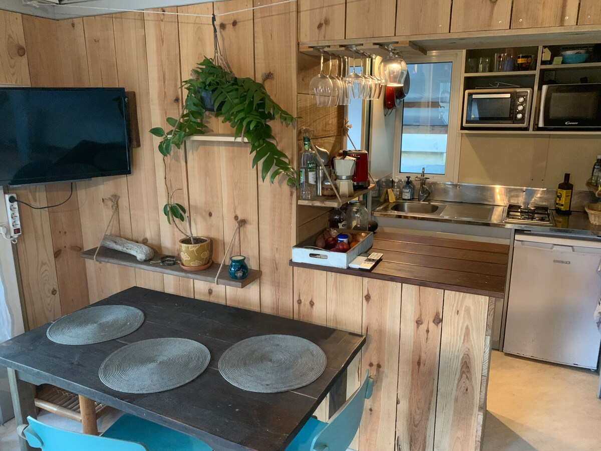 Karavan di kawasan yang tenang / pemandangan laut / dapur musim panas