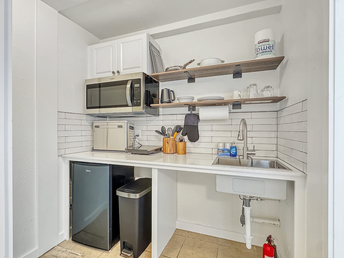 A great overnight stop or week away from home. The studio is attached to homeowners house (converted garage space) but has separate, private coded entry. Driveway parking for one car. TV with antenna channels and streaming capability, free Netflix, fast WiFi available. Kitchenette area with coffee maker, fridge, sink and microwave. Empty nesters occupy home. Quiet and safe neighborhood. Two person maximum. Spacious open floor plan - one bedroom, one bathroom. The bed is a queen size bed.