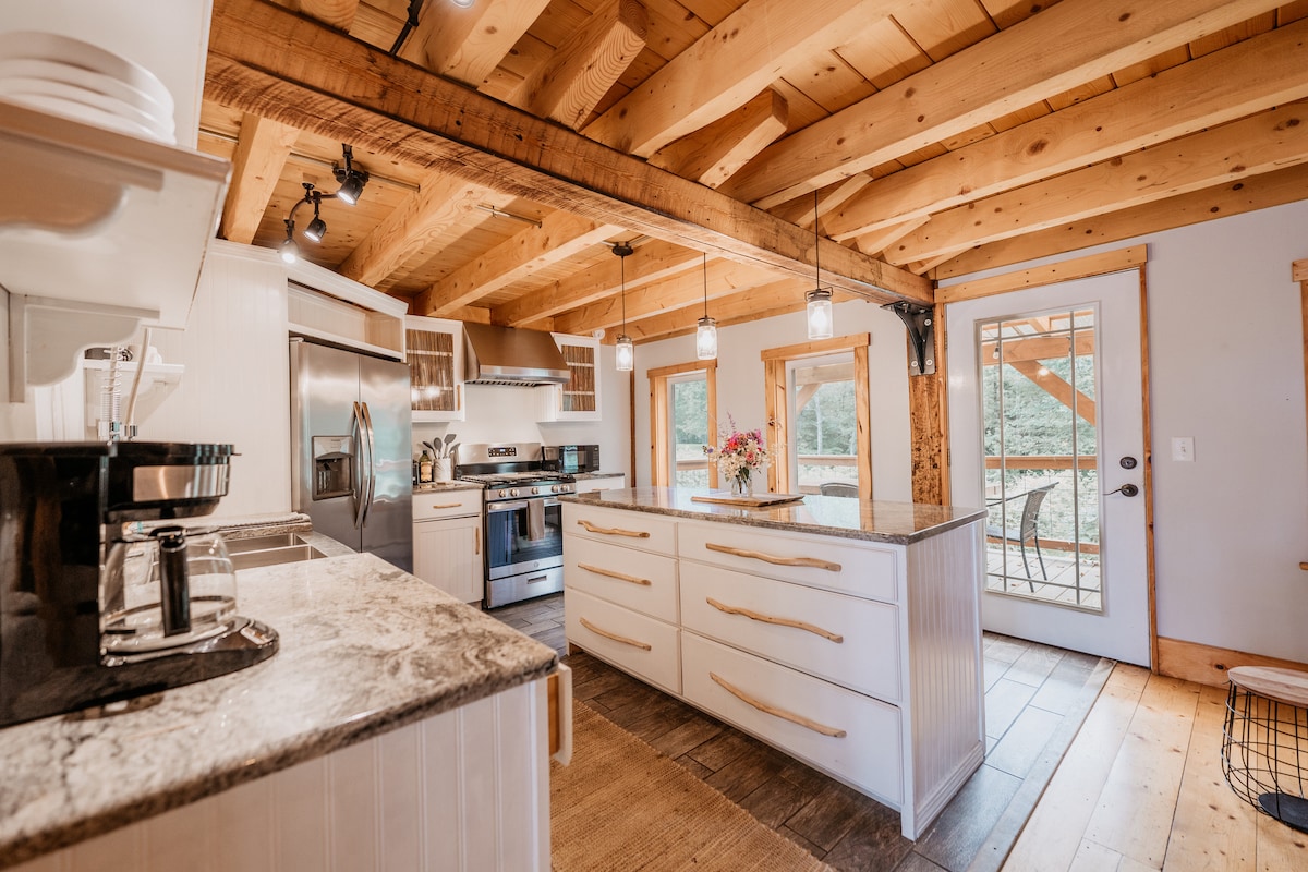 Rumah ladang tiga bilik tidur kami terletak di sudut penginapan yang tenang, walaupun tetamu masih menikmati akses mudah kepada semua kemudahan The Village Inn termasuk sauna. Menampilkan peralatan tahan karat dan kaunter granit serta tiga bilik tidur, ini adalah tempat yang luas dan damai untuk tinggal! Jika anda ingin menghabiskan masa di luar, terdapat beranda tertutup yang menghadap ladang anggur, patio batu persendirian dan kawasan tempat duduk tepi sungai dengan lubang api. Datang untuk hujung minggu atau menginap selama seminggu!