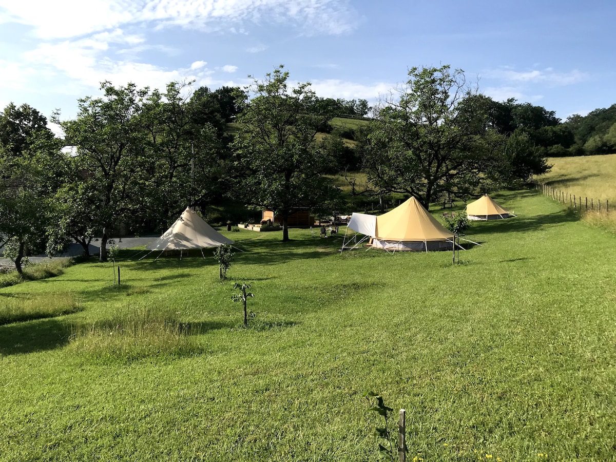 KHEMAH DOUBLE UNTUK 4 ORANG DI TENGAH-TENGAH ALAM SEMULA JADI! Datanglah ke bawah di tengah-tengah rumah ladang seluas 10 hektar kami yang dikelilingi oleh glamper dalam alam semula jadi dengan ketenangan fikiran sepenuhnya. Kelapa yang layak untuk malam-malam menanti anda. Penginapan Airbnb kami adalah "pilihan negara penuh": - Peralatan tempat tidur disediakan. - Kelengkapan mandi disediakan - Tandas kering - termasuk yuran pembersihan -Lawat ladang. (* contact kami untuk sarapan )