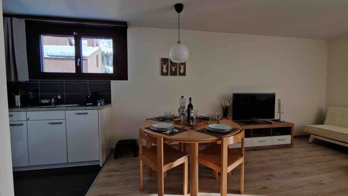 Sesuai untuk percutian ski, resort ski berjarak 2 minit berjalan kaki (ski boleh dilakukan). Apartmen 1.5 bilik terletak di penempatan apartmen "La Riva". Ia adalah 31m2 (+balkoni 5m2) dan dilengkapi dengan katil almari dan katil sofa (1.40m lebar). Sesuai untuk pasangan dengan 1 anak / maks. 2 orang anak. Di dalam rumah terdapat kolam renang, bilik kecergasan & ping pong serta 2 sauna. Selain itu, terdapat bilik ski, but ski dan basikal serta bilik dobi dan ruang letak kereta bawah tanah (maks. Ketinggian 1.90m).