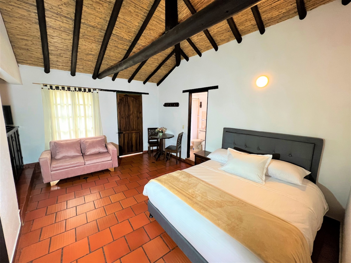 Nikmati pengalaman unik di Junior Suite kami di Casa Villa Bonita, sebuah hotel desa yang selesa di Villa de Leyva. Nikmati kemudahan katil double, TV, Wi-Fi, bilik mandi peribadi, dan sofa yang selesa untuk berehat. Yang paling menarik ialah balkoni dengan pemandangan gunung yang menakjubkan, sesuai untuk bersantai dan menikmati alam semula jadi. Kami juga mesra haiwan peliharaan, jadi anda boleh berkongsi pengalaman ini dengan haiwan peliharaan anda. Tempat yang ideal untuk berehat dan ketenangan.