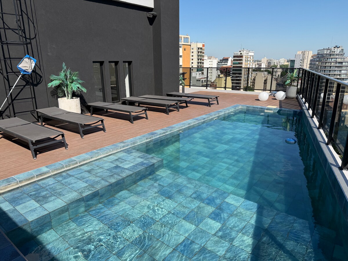 Apartmen dengan 2 bilik di kompleks Green Haus Belgrano yang menakjubkan di tiang gastronomi doho. Keselamatan 24 jam. Kemudahan penuh. Kolam renang DALAMAN YANG DIPANASKAN sepanjang tahun dan ditemui pada musim panas, quincho, gimnasium, kawasan kanak-kanak. Kelajuan maksimum WiFi 300 MB, sesuai untuk kerja jarak jauh. Boleh memuatkan hingga 4 tetamu. Diskaun untuk penginapan jangka panjang. Garaj tersedia dengan kos tambahan Akses kunci digital