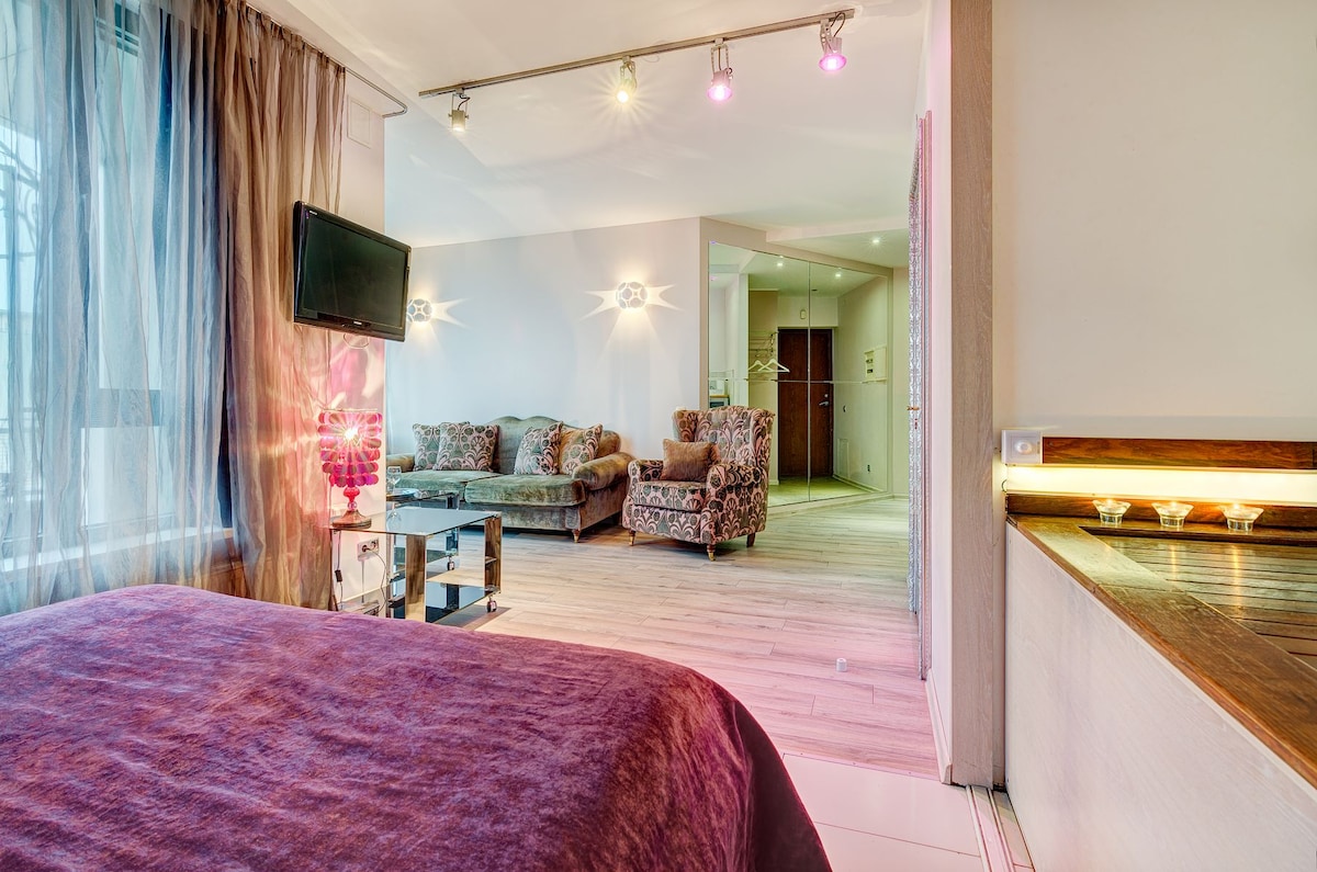 Apartmen yang luas dengan dua bilik tidur, masing-masing dengan katil double, dan ruang tamu yang selesa dengan katil sofa, meja makan dan dapur dengan semua kemudahan yang diperlukan; dua bilik mandi, satu dengan tab mandi dengan jakuzi, satu lagi mempunyai pancuran mandi yang besar; terletak di tengah-tengah Vilnius.