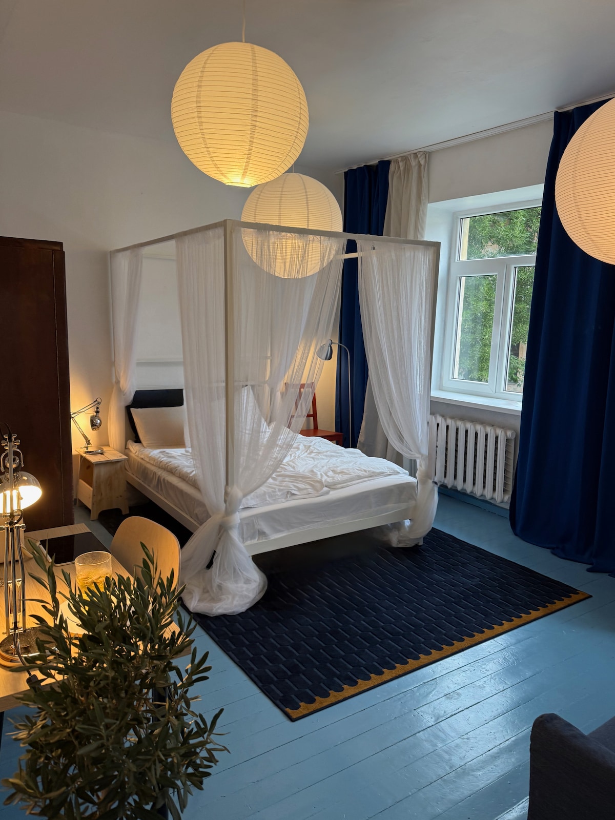 Apartmen yang direka dengan teliti ini terletak di halaman yang mengantuk di tengah-tengah Užupis bohemia, terletak di atas bukit dan dipisahkan daripada Bandar Lama oleh sungai yang melilit tepinya seperti ekor kucing liar. Flat tingkat bawah yang mewah ini sama eklektiknya dengan persekitarannya, yang direka dalam gaya Arabesque yang dipesan lebih dahulu dan dipenuhi dengan tekstur, warna dan perincian. Ia sangat sesuai untuk mereka yang akan bersiar-siar di jalan-jalan yang bengkok dan lorong-lorong belakang yang menarik.