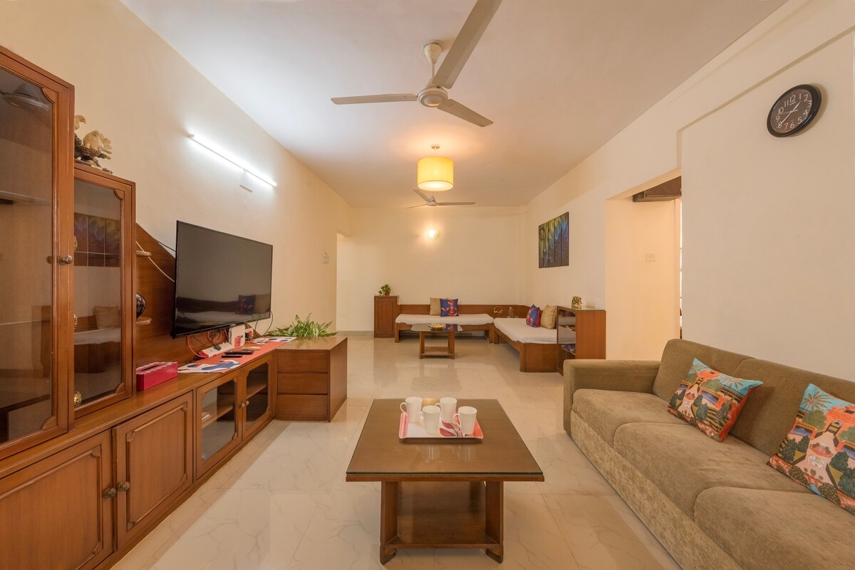 Welcome to our brand-new, spacious 2-BHK apartment, ideal for families and couples seeking comfort and convenience. The bedrooms have queen size beds with orthopedic mattresses and AC for a restful night's sleep. Relax in the large living room with a 43-inch Smart TV, lightning-fast WiFi and a dedicated dining area. Comes with two super clean bathrooms stocked with bath essentials. The fully equipped kitchen includes high-quality appliances and crockery for your culinary adventures!