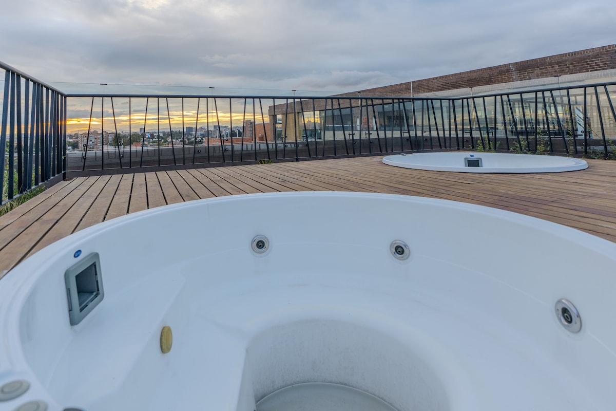 Terletak di kawasan terbaik di Bogotá. sesuai untuk perjalanan perniagaan, percutian dan keluarga kecil yang ingin menginap di apartmen studio. Anda akan berada dalam jarak berjalan kaki dari tiga pusat membeli-belah utama, restoran terbaik, gimnasium, pasar raya, bar, kelab, taman, kedai kopi, hospital dan stesen trasnport awam di bandar. Apartmen studio baharu ini menawarkan keselamatan penjaga pintu 24/7 teres panorama di tingkat atas bangunan, jakuzi dan pemandangan hadapan ke salah satu taman utama Bogota, el Virrey