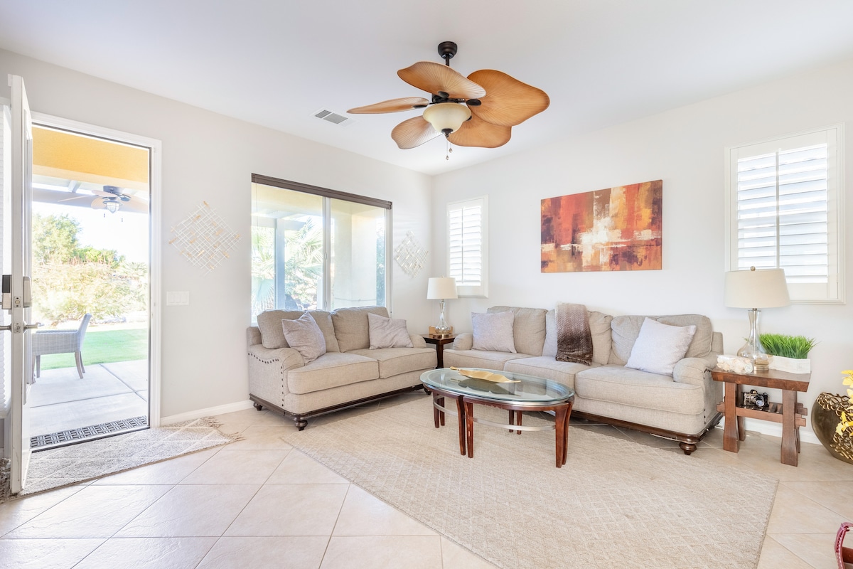 Bersantai di rumah bergaya ini di Indian Palms Country Club, hanya 1.5 batu ke Coachella & Stagecoach! Menampilkan 2 suite utama Cal King, kolam air masin persendirian & spa, pemandangan padang golf, bunyi SONOS, dapur penuh, 4 basikal penjelajah, dan banyak lagi. Nikmati kemewahan yang tenang dengan akses mudah kepada muzik, golf dan acara berkuda. 🔑 Syarat-syarat Tempahan: Profil Airbnb mesti termasuk nama, e-mel & ID bergambar Nama tetamu diperlukan 21+ untuk disewa Sesuai untuk perayaan, acara berkuda, atau percutian santai!