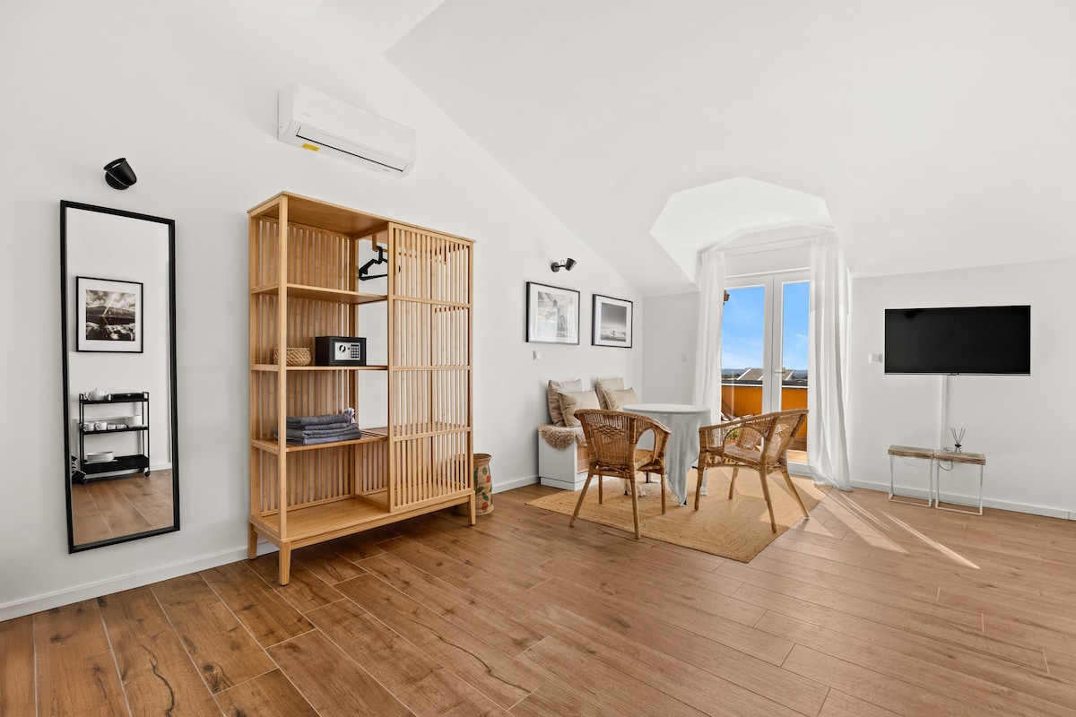 Kami ingin memperkenalkan anda kepada apartmen studio baharu kami yang mempesonakan, yang menawarkan pemandangan panorama laut yang menakjubkan di kejauhan. Percutian selesa ini menggabungkan keselesaan moden dengan suasana yang tenang. Reka bentuk terbuka memaksimumkan ruang dan mengintegrasikan ruang tamu, ruang makan dan tidur dengan lancar. Kagumi ufuk jauh keselesaan ruang tamu anda.