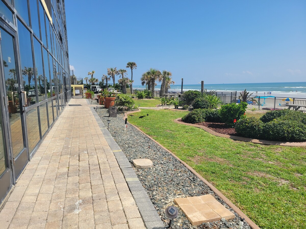 1BR terus menghadap Daytona Beach! Tingkap balkoni & ruang tamu menghadap pantai & kolam renang terus. Akses terus ke pantai adalah melalui sebelah utara bangunan di mana terdapat tempat letak kereta, tanjakan dan pancuran mandi luar) Bilik berada di tingkat 3, 2 kiri dari lif ke bilik. ** Daftar Keluar 12 Tengah Hari Baru dan bukannya 11 untuk kemudahan anda! 2 katil Queen & sofa tidur-sempurna untuk penginapan keluarga di 🏖️☀️🌊