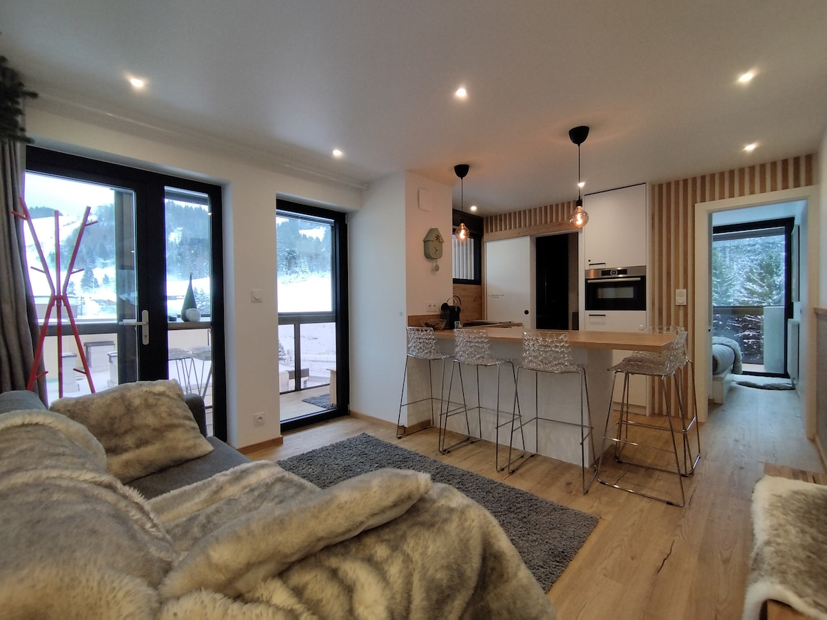 Apartmen + teres berperabot 28 m2, tanpa pagar yang menghalang pemandangan tasik yang menakjubkan Tempat letak kereta persendirian DAN garaj. Wifi. Cadar, tuala teh, tikar mandi disediakan. Tuala mandi dengan tambahan. Katil bayi dan kerusi penggalak tersedia. Loker ski. Tobogan, tongkat berjalan. Kedai-kedai dan pusat bandar 8 min berjalan kaki Dekat dengan pengangkutan ski dan denai hiking. Taman air, kesejahteraan, sauna, gelanggang ais, boling, memanjat dalam jarak 3 minit berjalan kaki
