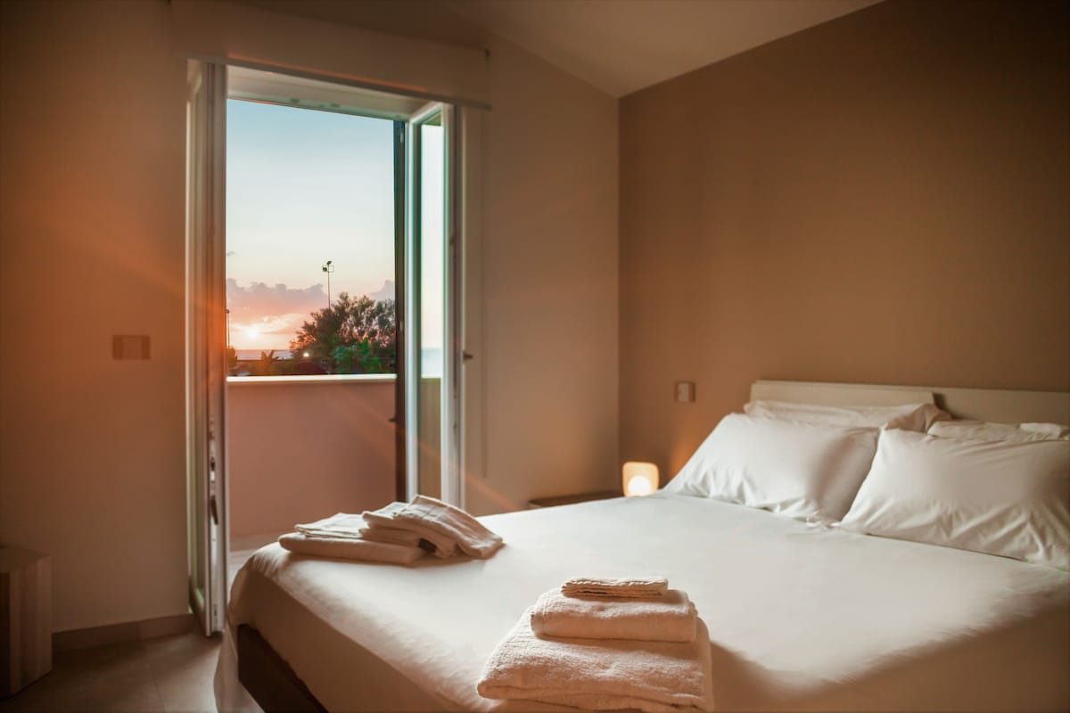 Our holiday home is on the 2nd floor, It consists of a kitchen / living room with a sofa-bed for one and a half, a bedroom and a bathroom with shower, as well as 2 large covered terraces with sea view and it can accommodate 2 to 4 people; The terraces are both equipped with tables and chairs for outdoor dining, there is a barbecue and a sun terrace with sun loungers.