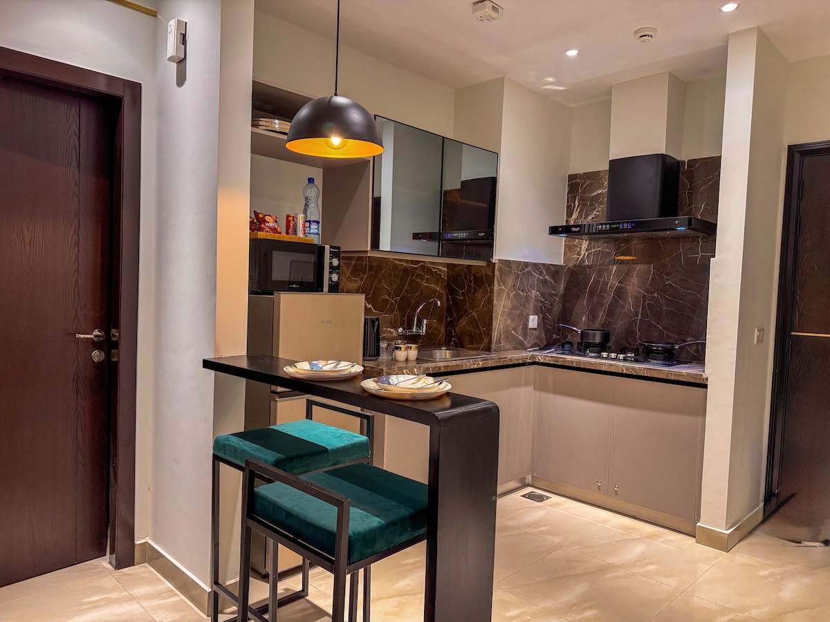 1BR Super Mewah di Zameen Aurum | Kolam Renang Atas Bumbung | Pawagam | Balkoni | Kafe | Gulberg Alami kehidupan mewah di pusat bandar Gulberg di apartmen 1 bilik tidur yang elegan ini di Zameen Aurum. Direka dalam gaya Luxe yang tenang, ruang ini termasuk balkoni persendirian, dapur lengkap, bilik mandi gaya spa, dan ruang istirehat selesa dengan TV Pintar Q-led 60'